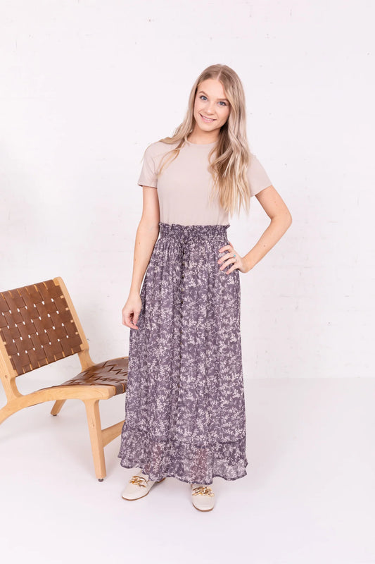 Button Front Skirt in Pewter Branches- Misses & Plus (2X)