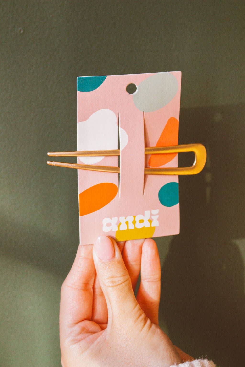 Hair Pins are the next claw clip! They are such a simple and beautiful tool that easily holds your hair in so many different ways. Andi’s hair pins match any vibe, any outfit, and any occasion. This pin is a beautiful U-shape, in a matte, gold metal. It will look stunning in your hair, and will be so comfortable, you'll forget it's even there.