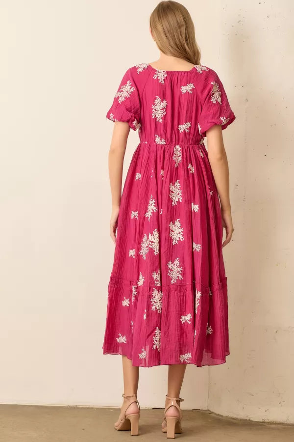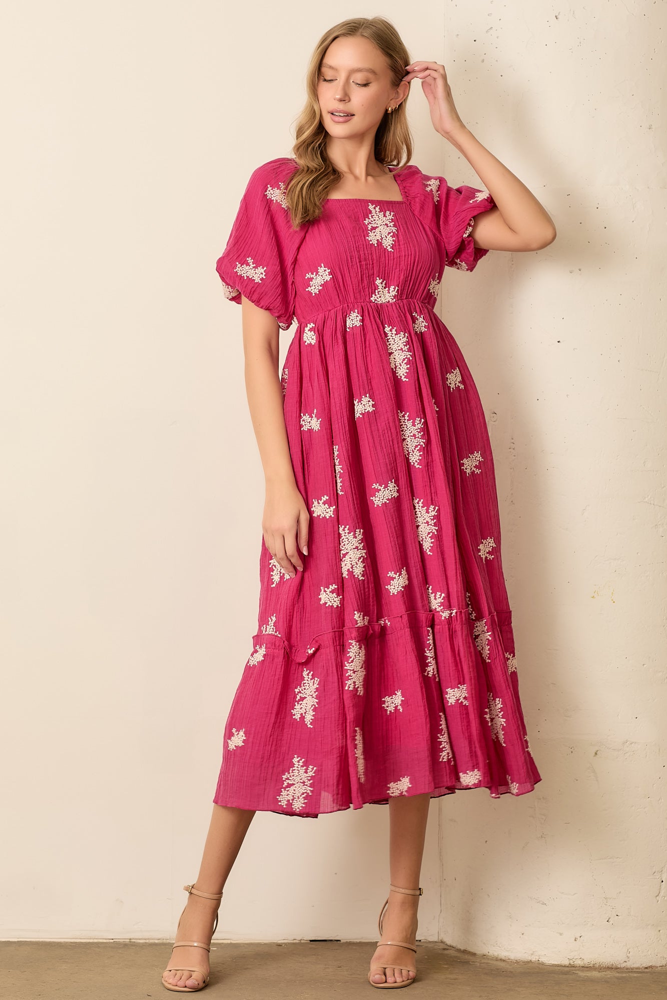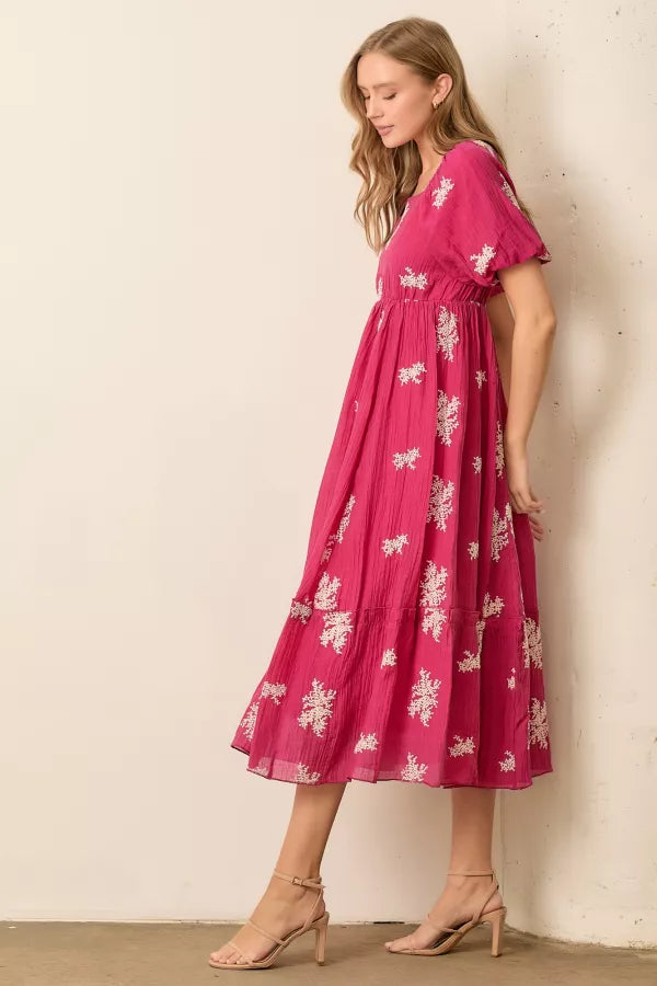 Elevate your style with our Grace Dress in Berry! Featuring a square neckline, short puffed sleeves, and a square bubble embroidered detail on the sleeves, this maxi dress is a must-have for any fashion-forward wardrobe. Don't miss out on this stunning piece, available in sizes S-3X!
