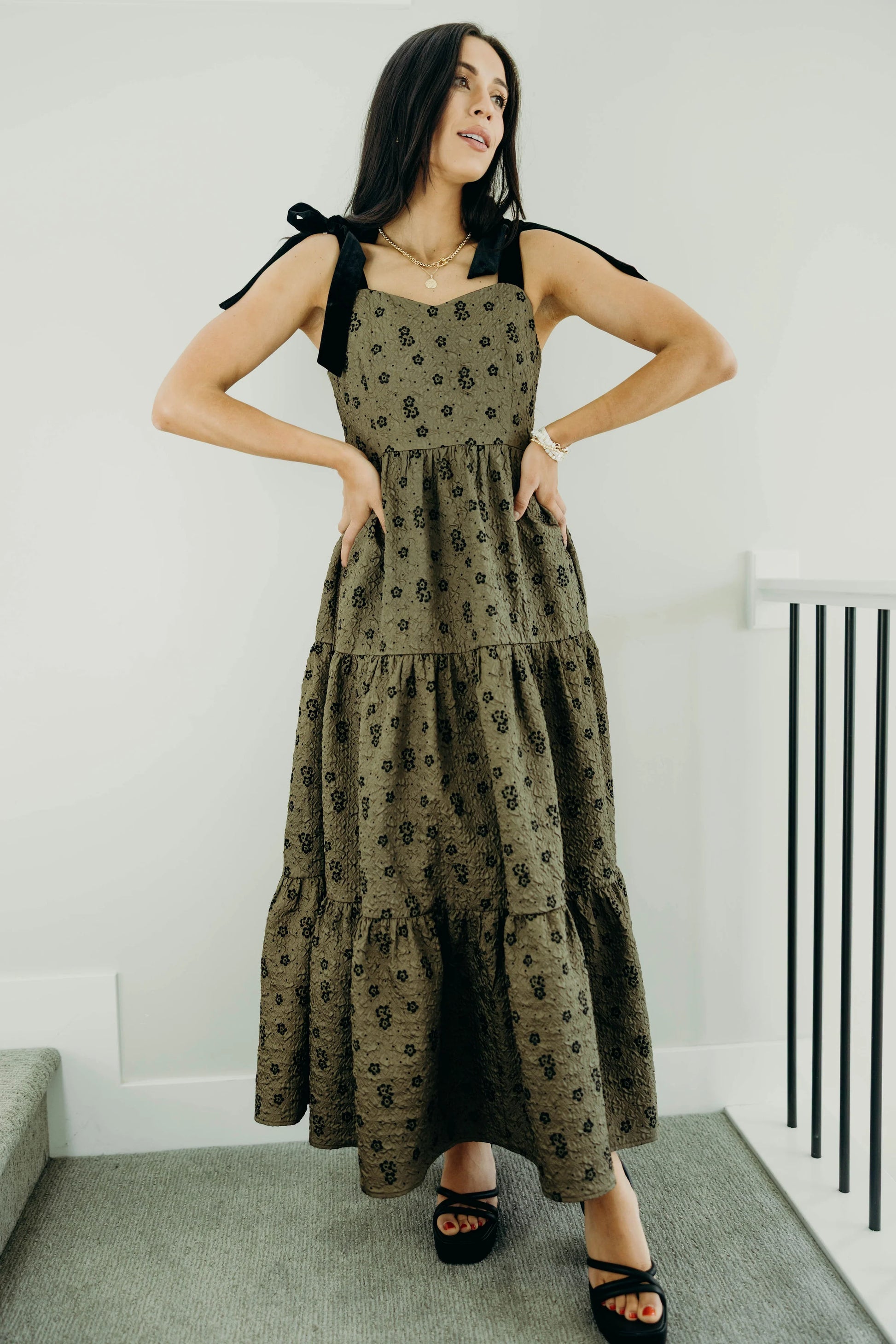 Midi length overall dress with tiered skirt, sweetheart neckline, velvet shoulder ties, and zipper closure.