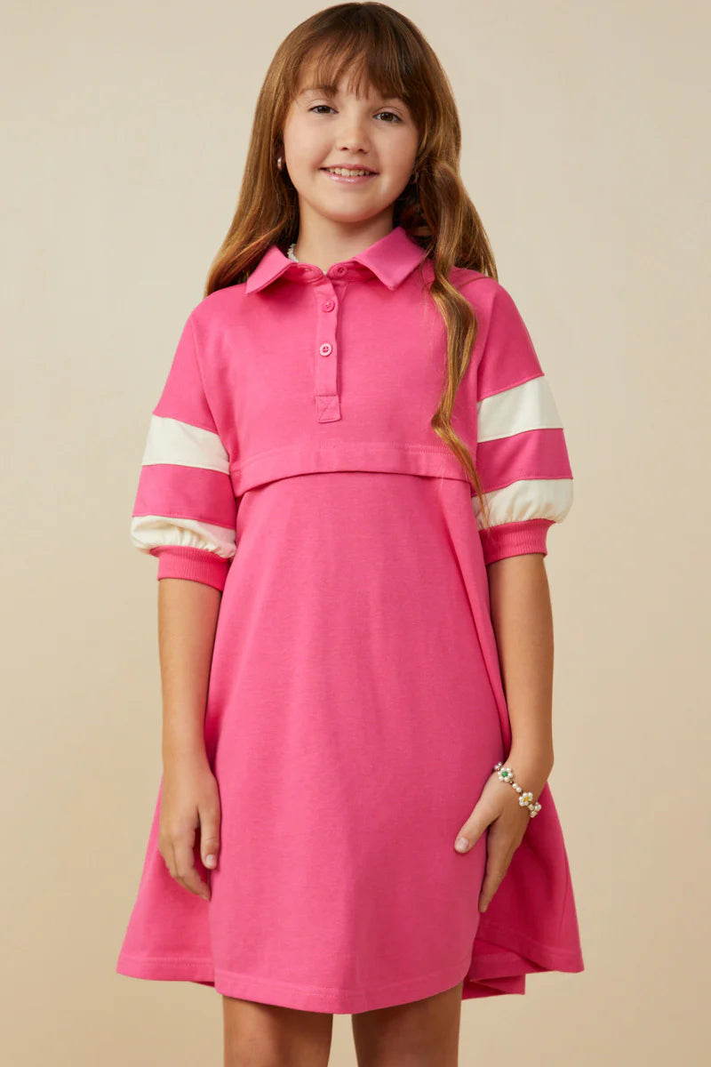 Comfy meets cute in the Kenna Dress! Made from soft French terry knit, this collared cutie brings sporty charm to her everyday style. The playful colorblock sleeves, button-front detail, and easy fit make it perfect for school days, playdates, or twirling around with friends. It’s one of those dresses she’ll reach for again and again—because comfort never goes out of style!