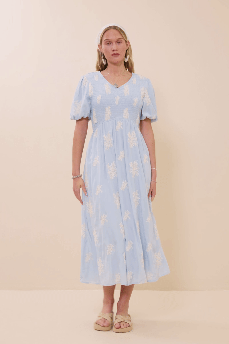 ☁️ Details: V neckline, puff sleeves, embroidered detailing, midi length