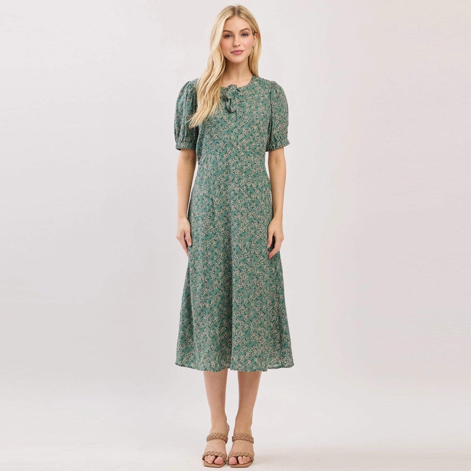 The Verity Dress is a soft, feminine favorite made for effortless everyday wear. This beautiful silhouette features a round neckline with a dainty tie detail, puff sleeves with gentle elastic, and a flowy skirt that moves gracefully with you. The agave green floral print gives it a romantic, timeless feel, making it a lovely choice for church, outings, or any day you want to feel a little extra pretty.