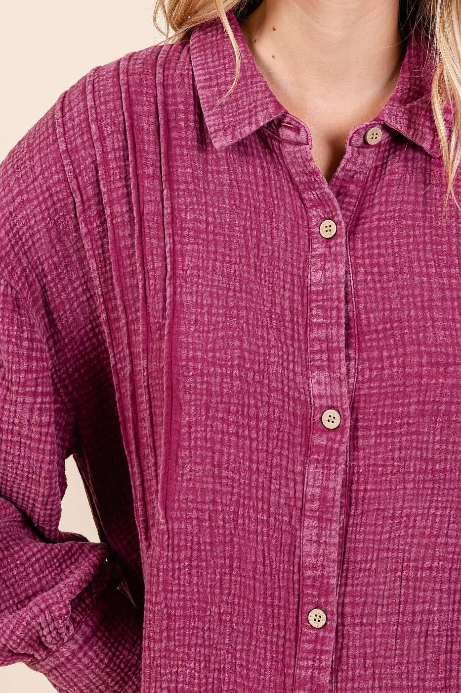 The Zinnia Dress in Raspberry brings soft texture and timeless charm together in one effortless piece. Crafted from mineral-washed cotton gauze, this relaxed midi features a collared neckline, button-down front, and pintuck detailing across the shoulders for a touch of classic structure.